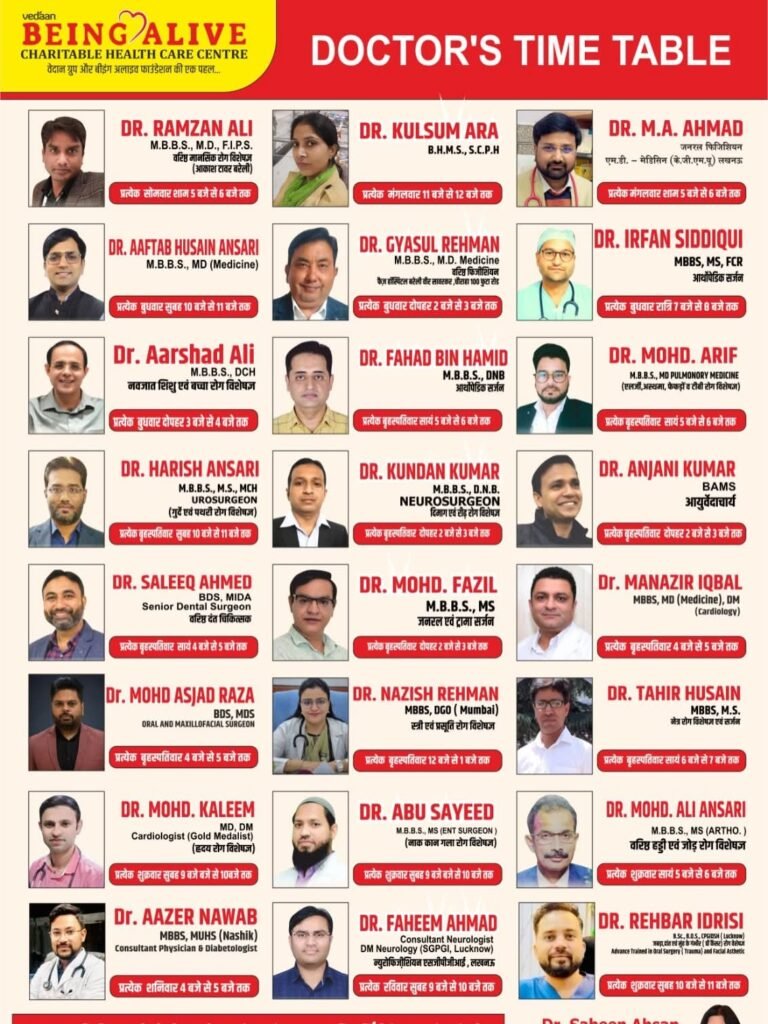 इस तरह बरेली में जरूरतमंदों को अब अलग-अलग अस्पतालों के चक्कर लगाने की आवश्यकता नहीं है, बल्कि एक ही स्थान पर बहु-विशेषज्ञ (Multi-Speciality) सेवाएं उपलब्ध हो रही हैं।साप्ताहिक डॉक्टर टाइम-टेबल से मरीजों को सुविधामरीजों की सुविधा को ध्यान में रखते हुए सेंटर में डॉक्टरों का साप्ताहिक टाइम-टेबल निर्धारित किया गया है, जिससे लोग तय समय पर आकर बिना किसी असुविधा के विशेषज्ञ परामर्श प्राप्त कर सकें।सोमवार: शाम 5 से 6 बजे तक वरिष्ठ मानसिक रोग विशेषज्ञ डॉ. रमजान अली (MBBS, MD, FIPS)मंगलवार: 11 से 12 बजे तक होम्योपैथी विशेषज्ञ डॉ. कुलसुम आरा, शाम 5 से 6 बजे तक जनरल फिजिशियन डॉ. एम.ए. अहमद (MD Medicine, KGMU Lucknow)बुधवार: सुबह डॉ. आफताब हुसैन अंसारी (MD Medicine), दोपहर में नवजात एवं बाल रोग विशेषज्ञ डॉ. आरशद अली, तथा सायं/रात्रि में वरिष्ठ फिजिशियन व ऑर्थोपेडिक विशेषज्ञबृहस्पतिवार: यूरोसर्जन डॉ. हरीश अंसारी, न्यूरोसर्जन डॉ. कुंदन कुमार, स्त्री एवं प्रसूति रोग विशेषज्ञ डॉ. नाजिश रहमान, आयुर्वेदाचार्य डॉ. अंजनी कुमार, दंत चिकित्सक डॉ. सलीक अहमद व डॉ. मोहम्मद असजद रज़ा, हृदय रोग विशेषज्ञ डॉ. मनाज़िर इक़बाल, नेत्र रोग विशेषज्ञ डॉ. ताहिर हुसैन, ऑर्थोपेडिक एवं पल्मोनरी मेडिसिन विशेषज्ञ सहित कई वरिष्ठ डॉक्टरशुक्रवार: गोल्ड मेडलिस्ट कार्डियोलॉजिस्ट डॉ. मोहम्मद कलीम, ईएनटी सर्जन डॉ. अबू सईद, ट्रॉमा एवं जनरल सर्जन, हड्डी एवं जोड़ रोग विशेषज्ञशनिवार: डायबिटीज एवं फिजिशियन परामर्शरविवार: एसजीपीजीआई लखनऊ से जुड़े वरिष्ठ न्यूरोलॉजिस्ट डॉ. फहीम अहमदसेवा भाव से जुड़ी पहलइस चैरिटेबल हेल्थ केयर सेंटर की सबसे बड़ी ताकत यहां सेवा भाव से जुड़े डॉक्टर हैं, जो बिना किसी व्यावसायिक उद्देश्य के मानवता की सेवा को प्राथमिकता दे रहे हैं। वेदान ग्रुप और बीइंग अलाइव फाउंडेशन की यह पहल न केवल सस्ती और गुणवत्तापूर्ण चिकित्सा सेवाएं उपलब्ध करा रही है, बल्कि समाज में सकारात्मक बदलाव की दिशा में एक मजबूत कदम भी साबित हो रही है।स्थानीय नागरिकों, सामाजिक संगठनों और मरीजों ने इस प्रयास की खुले दिल से सराहना की है और इसे बरेली के लिए एक ऐतिहासिक व प्रेरणादायक पहल बताया है।Being Alive 🤗हर दिल, हर ज़ुबां—अब इलाज हुआ आसान।