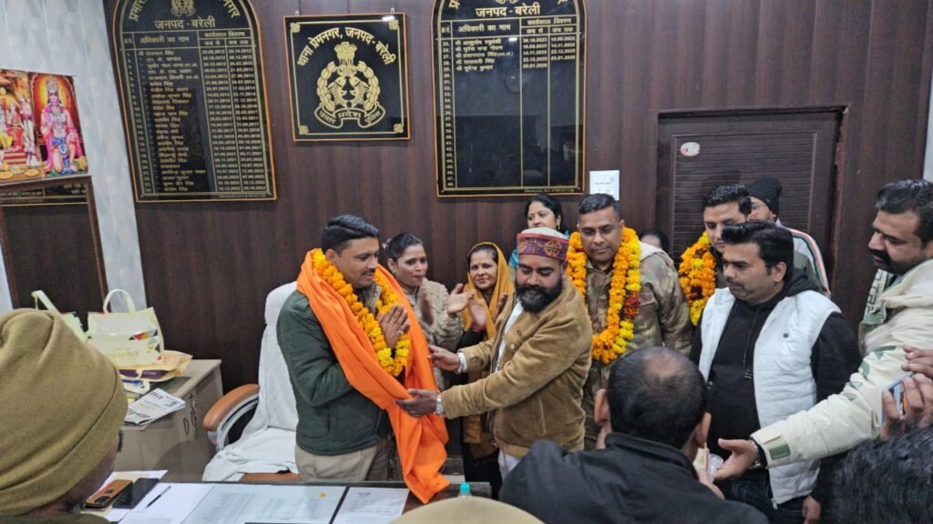 बरेली।आजाद हिन्दू सेना द्वारा लंबे समय से चले आ रहे संतोषी माता मंदिर से जुड़े विवाद को शांतिपूर्ण ढंग से सुलझाने में अहम भूमिका निभाने पर प्रेमनगर पुलिस को सम्मानित किया गया। इस अवसर पर प्रेमनगर थाना प्रभारी सुरेंद्र कुमार यादव एवं कानून गोयान चौकी प्रभारी सरताज अली को भगवा शॉल ओढ़ाकर तथा आजाद हिन्दू सेना का मोमेंटो भेंट कर सम्मानित किया गया।सम्मान समारोह में वक्ताओं ने कहा कि किसी भी धार्मिक या सामाजिक विवाद का समाधान संवाद, संयम और कानून व्यवस्था के सहयोग से ही संभव है। संतोषी माता मंदिर विवाद के दौरान प्रेमनगर पुलिस ने जिस सूझबूझ, निष्पक्षता और तत्परता का परिचय दिया, उससे क्षेत्र में शांति और सौहार्द का वातावरण बना रहा। आजाद हिन्दू सेना ने पुलिस प्रशासन के सकारात्मक सहयोग के लिए आभार व्यक्त किया।इस अवसर पर थाना प्रभारी सुरेंद्र कुमार यादव ने कहा कि पुलिस का प्रथम कर्तव्य जनता की सुरक्षा के साथ-साथ सामाजिक सौहार्द बनाए रखना है। उन्होंने भरोसा दिलाया कि भविष्य में भी पुलिस सामाजिक व धार्मिक मुद्दों पर सभी वर्गों के साथ संवाद बनाकर कार्य करेगी।कार्यक्रम के दौरान सामाजिक मुद्दों, क्षेत्रीय समस्याओं तथा आपसी समन्वय को और अधिक मजबूत करने को लेकर भी विचार-विमर्श किया गया।सम्मान समारोह में आजाद हिन्दू सेना के राष्ट्रीय अध्यक्ष अमित राठौर विशेष रूप से उपस्थित रहे। उनके साथ जिला अध्यक्ष उमंग शंखधार, महिला मोर्चा जिला अध्यक्ष मोना श्रीवास्तव, विशाल सक्सेना, शुभोत शर्मा, सुमित कांत गोयल, मोजी भाई, आयुष, नगर प्रभारी शुभम श्रीवास्तव, पलक श्रीवास्तव, शिवानी, मीनू सहित अनेक कार्यकर्ता मौजूद रहे।