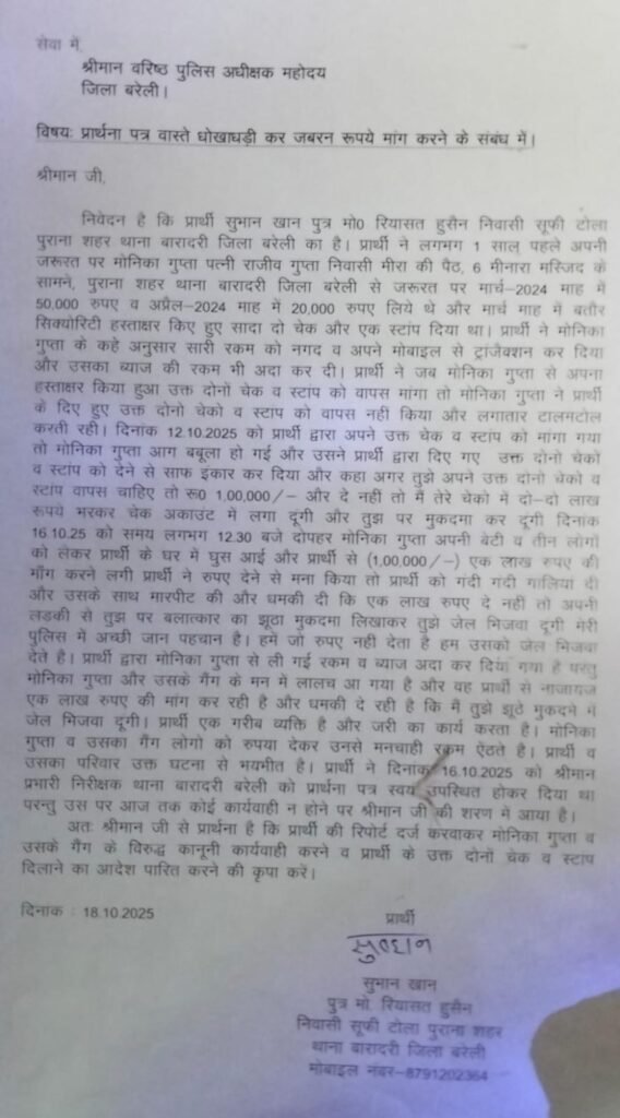 बरेली : पीड़ित सुभान खान पुत्र मो० रियासत हुसैन निवासी सूफी टोला पुराना शहर के रहने वाले ने एस एस पी को शिकायती पत्र देकर बताया कि लगभग 1 साल पहले अपनी जरूरत पर मोनिका गुप्ता पत्नी राजीव गुप्ता निवासी मीरा की पैठ, 6 मीनारा मस्जिद के सामने, पुराना शहर थाना बारादरी जिला बरेली से जरूरत पर मार्च-2024 माह में 50,000 रुपए व अप्रैल 2024 माह में 20,000 रुपए लिये थे और मार्च माह में बतौर सिक्योरिटी हस्ताक्षर किए हुए सादा दो चेक और एक स्टांप दिया था। पीड़ित ने मोनिका गुप्ता के कहे अनुसार सारी रकम को नगद व अपने मोबाइल से ट्रांजैक्शन कर दिया और उसका ब्याज की रकम भी अदा कर दी। पीड़ित ने जब मोनिका गुप्ता से अपना हस्ताक्षर किया हुआ उक्त दोनों चेक व स्टांप को वापस मांगा तो मोनिका गुप्ता ने पीड़ित के दिए हुए उक्त दोनो चेको च स्टाप को वापस नहीं किया और लगातार टालमटोल करती रही। दिनांक 12 अक्टूबर 2025 को पीड़ित द्वारा अपने उक्त चेक व स्टांप को मांगा गया तो मोनिका गुप्ता आग बबूला हो गई और उसने पीड़ित द्वारा दिए गए उक्त दोनो चेकों व स्टाप को देने से साफ इंकार कर दिया और कहा अगर तुझे अपने उक्त दोनो चेको व स्टॉप वापस चाहिए तो रू0 1,00,000/- और दे नहीं तो मैं तेरे चेको में दो-दो लाख रूपये भरकर चेक अकाउंट में लगा दूंगी और तुझ पर मुकदमा कर दूंगी दिनांक 16 अक्टूबर 25 को समय लगभग 12:30 बजे दोपहर मोनिका गुप्ता अपनी बेटी व तीन लोगों को लेकर पीड़ित के घर में घुस आई और पीड़ित से (1,00,000/-) एक लाख रूपए की माँग करने लगी पीड़ित ने रुपए देने से मना किया तो पीड़ित को गंदी गंदी गालियां दी और उसके साथ मारपीट की और धमकी दी कि एक लाख रुपए दे नहीं तो अपनी लडकी से तुझ पर बलात्कार का झूठा मुकदमा लिखाकर तुझे जेल भिजवा दूंगी मेरी पुलिस में अच्छी जान पहचान है। हमें हमें जो रुपए नहीं देता है हम उसको जेल भिजवा देते है। पीड़ित द्वारा मोनिका गुप्ता से ली गई रकम व ब्याज अदा कर दिया गया है परंतु मोनिका गुप्ता और उसके गैंग के मन में लालच आ गया है और वह पीड़ित से नाजायज एक लाख रुपए की मांग कर रही है और धमकी दे रही है कि मैं तुझे झूठे मुकदमे में जेल भिजवा दूंगी। पीड़ित एक गरीब व्यक्ति है और जरी का कार्य करता है। मोनिका गुप्ता व उसका गैंग लोगो को रुपया देकर उनसे मनचाही रक्रम ऐंठते है। पीड़ित व उसका परिवार उक्त घटना से भयभीत है। पीड़ित ने दिनांक 16 अक्टूबर 2025 को निरीक्षक थाना बारादरी बरेली को शिकायती पत्र स्वयं उपस्थित होकर दिया था मोनिका गुप्ता उर्फ मोहिनी व उसके गैंग के विरुद्ध कानूनी कार्यवाही करने व पीड़ित के उक्त दोनों चेक व स्टांप दिलाने की गुहार लगाई जिसपर थाना पुलिस ने जांच शुरू की तो सूदखोर मोनिका गुप्ता उर्फ मोहिनी ने पीड़ित को फोन कर धमकी दी कि कल सुबह तेरे घर पर आकर अपना पैसा 